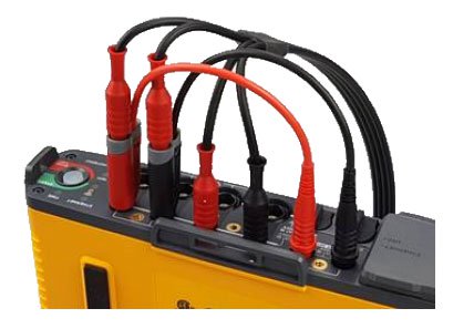 請謹慎操作,避免任何上述錯誤的接線配置。 福祿克強烈建議您停止使用“Voltage Test Lead, 3-phase + N”(電壓測試線,3相+ N)電纜組,并聯系福祿克免費更換測試線套件。替換測試線套件采用直插式香蕉連接器,而非可堆疊連接器。 為了便于從測量端子為記錄儀供電,替換測試線套件還包含帶有可堆疊連接器和直插式香蕉連接器的短跳線附件。這種替換測試線套件配置避免了端子連接錯誤的可能性。請參見下圖。 替換測試線組已安裝。