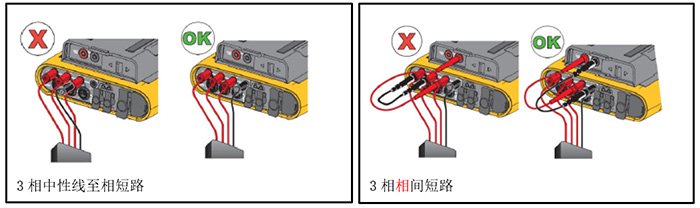 福祿克已確定,如果173x系列、174x系列電能質量記錄儀和3540FC功率監測儀標配的電壓測試線組3PHVL-1730或3PHVL-1730-5M “Voltage Test Lead, 3-phase + N”(電壓測試線,3相+ N)使用不當,可能會使用戶暴露于危險環境之中,造成嚴重人身傷害或儀器損壞。 雖然上述測試線組本身符合適用的安全標準要求,但將其連接至記錄儀時,用戶可能會錯誤連接測試線組上的電壓連接。請參見下面的[照片/圖示],直觀地了解接線錯誤情況。 雖然對于訓練有素的專業人員來說,下圖所示接線錯誤可能顯而易見,但一旦發生這種接線錯誤,則可能會導致相間或相至中性線短路,有可能導致電弧爆炸,造成嚴重人身傷害或儀器損壞風險。 可能導致短路的錯誤電壓連接示例(錯誤情況以紅色X表示): 174X系列錯誤的3相測試線連接