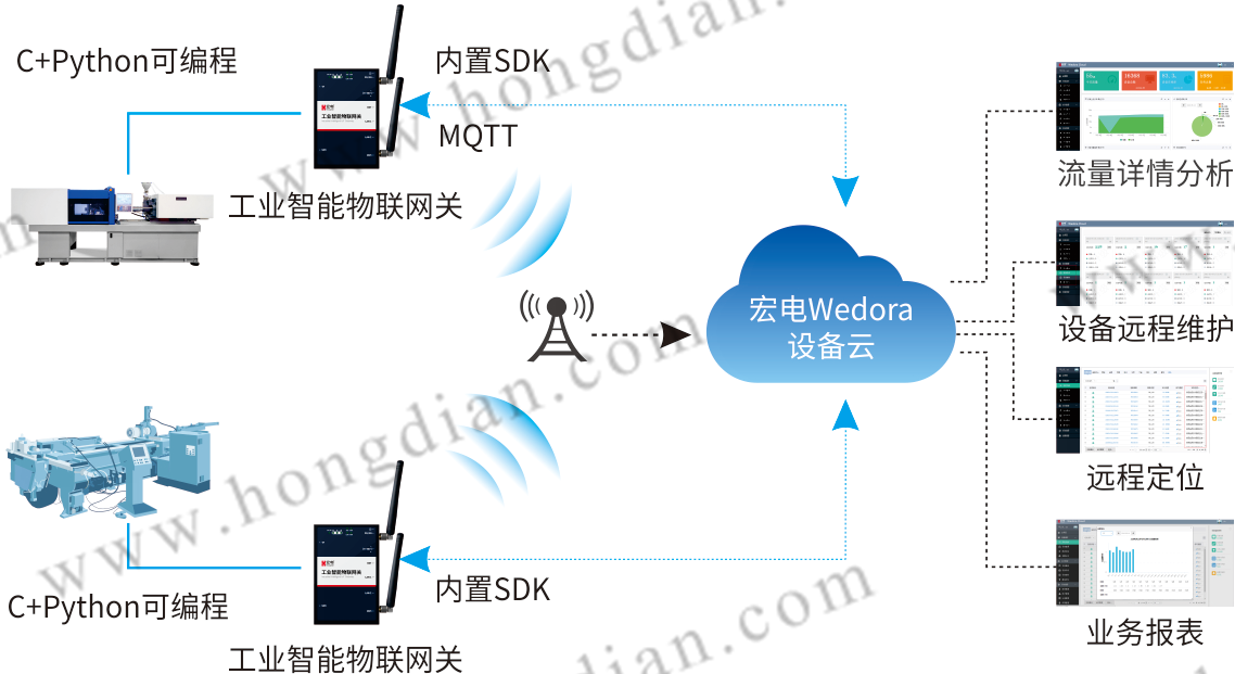 對于數控機床的生產廠商來說,他們需要掌握已售出的數控機床開工狀態和地域分布,以便精準的制定未來生產計劃和銷售策略;同時需要了解每臺設備的運行狀態和性能指標,進行預測性的維護,為客戶提供更好的服務。對于購買數控機床的制造企業來說,不僅需要實時監測數控機床的工作狀態,也需要一種解決方案來實現加工指令的快速發放,幫助工廠管理者更有效的分配企業資源,優化生產流程,避免數控機床的空轉、斷線或者停機維護, 深圳市宏電技術股份有限公司其中一個數控機床客戶就面臨這樣的問題,客戶是一家著名品牌數控機床在中國的合資公司,也是該品牌在中國大陸的唯一代表,承擔近百萬套數控機床的售后服務工作,其售后負責人希望能對售出的數控機床工作狀態、分布情況實時了解,以便精準的制定未來生產計劃和銷售策略,同時還希望在故障發生前就提前預測,避免數控機床的空轉、斷線或者停機維護,給企業生產運營帶來損失。 經過多次與數控機床廠家的交流,宏電認為首先需要解決設備聯網的網絡通道和網絡接入的問題,根據數控機床設備在全國、全球的點多分散及使用現場的環境,對數控機床CNC控制單元和測量數據單元的遠程診斷維護及數據監測,通過無線通信隨時通信、易部署特點,以邊緣計算網關—宏電工業智能物聯網關為載體建立機床設備之間互聯互通的通道,建立數控機床遠程智能監控系統,具體方案實施主要從以下幾個方面:
