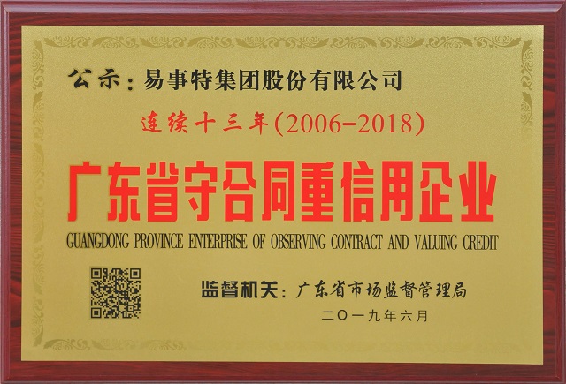 近日,“廣東省守合同重信用企業”名單公示,易事特集團憑借良好的信譽連續十三年(2006-2018)獲評“廣東省守合同重信用企業”榮譽稱號。
