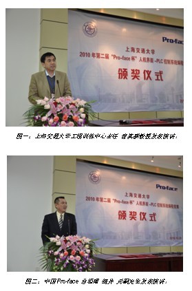 全球人機界面領導廠商Pro-face繼2009年與上海交通大學合作成立“上海交通大學-Pro-face人機界面與PLC可視化控制實驗室”,并成功舉辦首屆“Pro-face杯”人機界面-PLC控制系統(tǒng)編程競賽活動之后。2010年雙方繼續(xù)深入合作,將先進的人機界面技術和工業(yè)自動化應用在上海交通大學進行實踐教育,在對學生進行人機界面基礎知識和編程技能的集中培訓后,2010年11月28日,在上海工程訓練中心成功舉辦了2010年第二屆“Pro-face杯”人機界面-PLC控制系統(tǒng)編程競賽。上海交通大學教務處副處長高捷教授、工程訓練中心主任曹其新教授及相關領導和中國Pro-face細井元嗣總經(jīng)理出席了競賽頒獎儀式,曹其新教授和細井元嗣總經(jīng)理分別代表上海交通學校和Pro-face發(fā)表了演講。