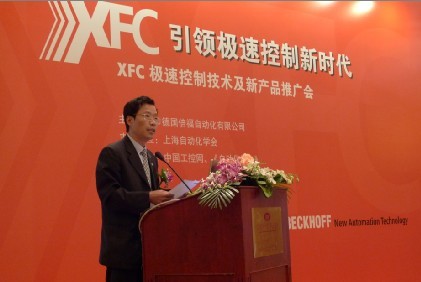 圖片注釋: 倍福中國區(qū)董事總經(jīng)理梁力強先生發(fā)表致辭并向觀眾介紹了XFC極速控制技術(shù)。
