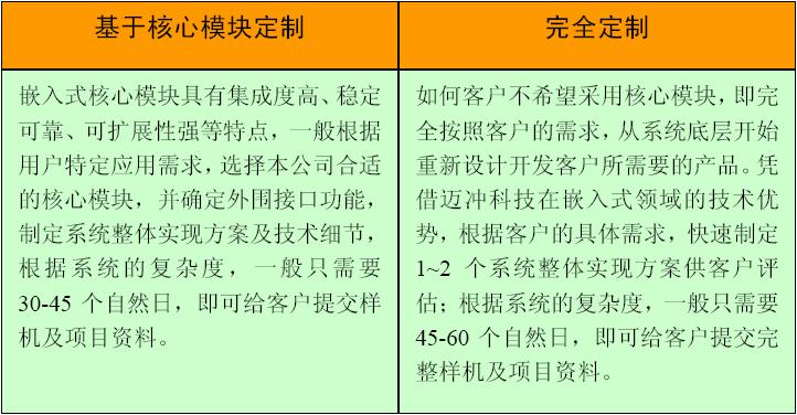 系統中最復雜、開發難度最高的部分,均可由技術成熟、穩定可靠的核心模塊提供,定制服務僅需要完成外圍接口電路的設計,極大地降低了產品開發難度,節約時間成本和資金成本;如果根據用戶需求,需要完全重新設計,邁沖科技亦可依靠其技術優勢,以最小的成本為客戶提供滿意的技術服務。