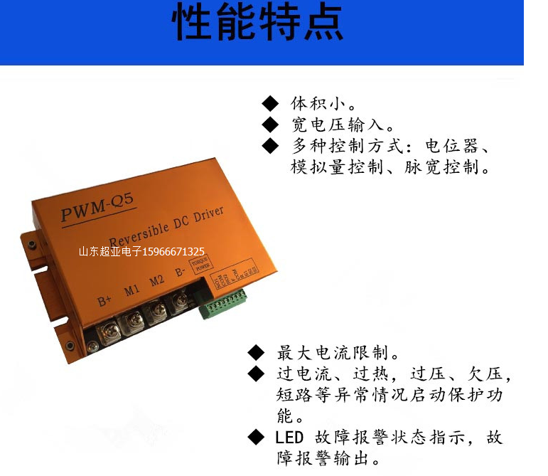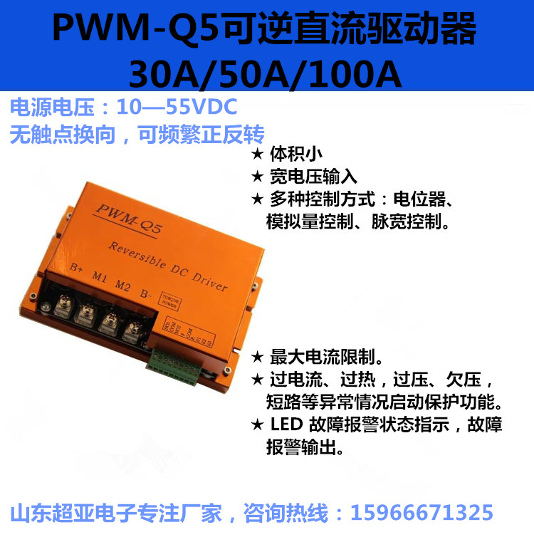 概述: PWM-Q5系列產(chǎn)品是一款智能型大功率直流馬達(dá)驅(qū)動(dòng)器。該驅(qū)動(dòng)器使用高性能MCU,采用高級(jí)運(yùn)動(dòng)控制算法,應(yīng)用于特殊功能要求的場合,可外部模擬量、脈寬控制和電位器調(diào)速,驅(qū)動(dòng)器設(shè)有故障報(bào)警輸出端,可以更有效的保護(hù)整套設(shè)備的可靠以及安全,可廣泛的用于自動(dòng)化控制行業(yè)。 二、規(guī)格及型號(hào):