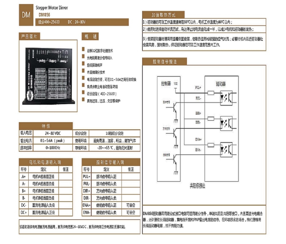 DM856型細分型兩相混合式步進電機驅動器,此驅動器采用交流伺服驅動器的電流環進行細分控制,電機的轉矩波動很小,低速運行很平穩,幾乎沒有振動和噪音。高速時力矩也大大高于其它二相驅動器,定位精度高。廣泛適用于雕刻機、數控機床、包裝機械等分辯率要求較高的設備上。