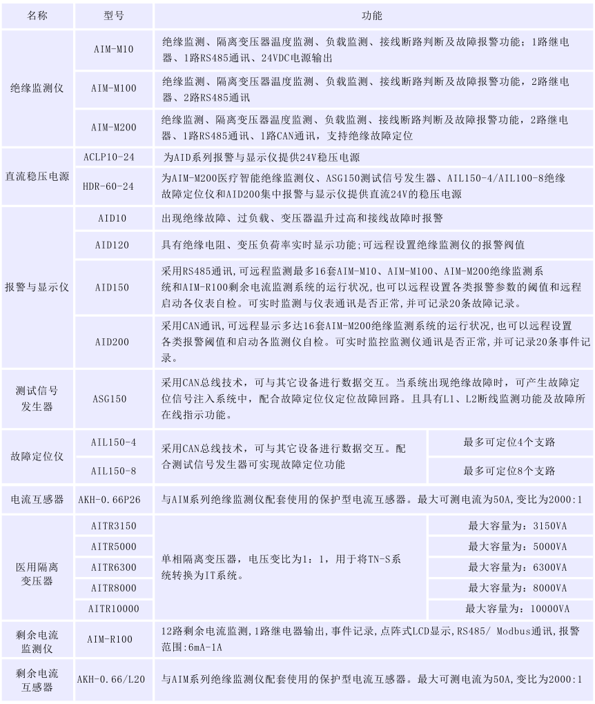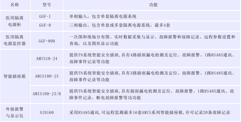 圖形顯示功能 系統可以以曲線的形式,顯示各IT配電系統的絕緣狀況、負載狀況,以及隔離變壓器的溫升狀況,以及它們的變化趨勢,以便于分管理人員了解和分析各電源系統的運行變化情況,有針對性的對某些系統進行維護和保養。 設備選型 醫療IT配電監測系統產品