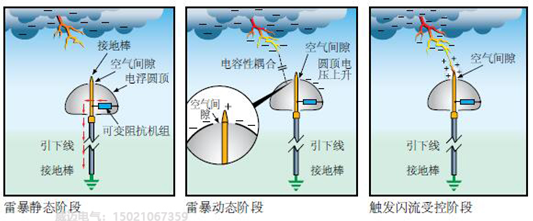 在雷暴的動態(tài)階段,在下行先導(dǎo)的更近的路徑上,接閃器的半球體或圓頂電壓將通過電容性耦合而上升。當(dāng)電壓足夠高時,球體和接地棒之間的空氣間隙處將產(chǎn)生觸發(fā)電弧。