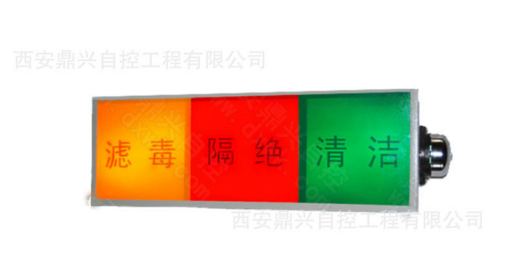 通風方式信號燈箱, 燈箱用于工程掩體內部空氣質量狀態的顯示和報警,主要對三種空氣質量情況進行報警:清潔、隔絕、濾毒。燈箱分別用三種顏色的燈光來對三種不用空氣情況報警:清潔——綠色燈光;隔絕——紅色燈光;濾毒——黃色燈光。