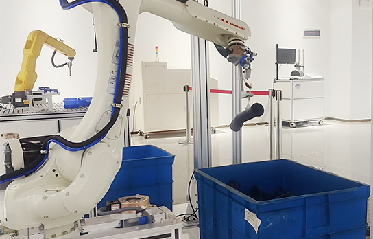 膠管無序擺放在料框中,3D視覺對工件進行識別和定位,引導機器人實現對膠管的無序抓取并上料,用機械臂替代人工,抓取精度±0.25mm,可24小時穩定運行。