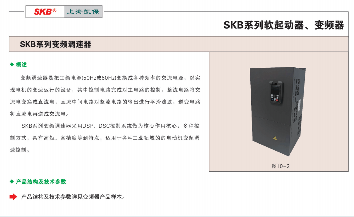 SKB系列變頻調速器采用DSP、DSC控制系統做為核心作用核心,多種控制方式,具有高矩、等到特點,適用于各種工業領域的的電動機變頻調速控制。