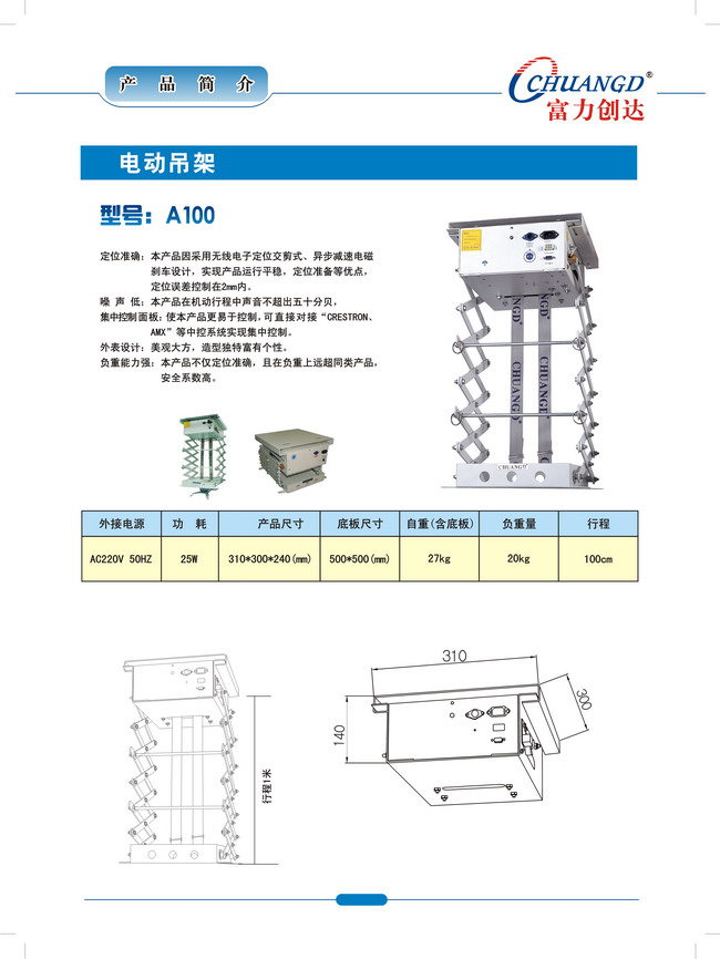 投影機(jī)電動(dòng)升降架采用異步減速電磁剎車電機(jī),微波定位雙交剪設(shè)計(jì),擁有造型美觀、運(yùn)行平穩(wěn)、噪音小、定位準(zhǔn)確、功能齊全、安裝方便、 操作簡(jiǎn)便、負(fù)重量大等特點(diǎn)。豐富的控制接口,可直接對(duì)接“CRESTRON、AMX”等中控系統(tǒng)實(shí)現(xiàn)集中控制,也可以單獨(dú)控制。可廣泛應(yīng)用于投影機(jī)工程、視頻會(huì)議系統(tǒng)、電視會(huì)議系統(tǒng)、大型會(huì)議系統(tǒng)等領(lǐng)域。1.定位準(zhǔn)確:本產(chǎn)品因采用微波定位交剪式、異少減速電磁剎車設(shè)計(jì),實(shí)現(xiàn)產(chǎn)品運(yùn)行平穩(wěn),定位準(zhǔn)備等優(yōu)點(diǎn),定位誤差控制在2mm內(nèi).2.噪聲低:  本產(chǎn)品具備現(xiàn)代化以人為本的同內(nèi)部設(shè)計(jì)模式,在機(jī)動(dòng)行程中不超出五十分貝的聲浪.3. 集中控制面板:使本產(chǎn)品更易于控制,可直接對(duì)接“CRESTRON、AMX”等中控系統(tǒng)實(shí)現(xiàn)集中控制.4.外表設(shè)計(jì)方面:美觀大方,造型獨(dú)特富有個(gè)性.5.負(fù)重能力強(qiáng):本產(chǎn)品不僅定位準(zhǔn)確,且在負(fù)重上遠(yuǎn)超同類產(chǎn)品,安全系數(shù)高.