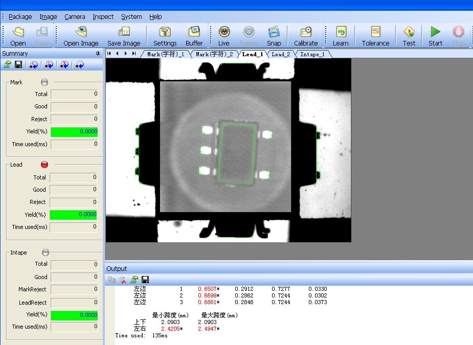 本系統是勁翔電子科技(合肥)有限公司自主研發的一款視覺產品。該系統主要用于半導體芯片檢測?梢园惭b在諸如Ismeca test handlers,SRM test handler,UENO test handler測試機上。安裝方便,操作簡單?梢蕴峁┬酒3D管腳檢測和2D字模及表面檢測。其中3D管腳檢測項目有:芯片的基準面,芯片管腳的共面程度,管腳的長度、寬度、間距、歪斜度、跨距。2D字模及表面檢測項目有:無標記、雙重標記、錯誤標記、標記位置錯誤以及無效標記,不完整填充、無IC、有污漬以及有裂痕。