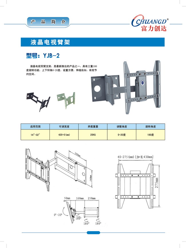 液晶電視雙、單壁支架,是最新研發(fā)的新產(chǎn)品,具有三重180度旋轉(zhuǎn)功能,上下仰角0-20度,設(shè)置方便,伸縮自如,有效節(jié)約空間