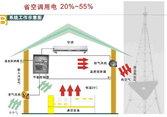 節能原理:由于基站內溫度的升高是因電氣設備的長期運行發熱、而非站外環境溫度所致。如一年四季均用空調來保持站內溫度(主要是降溫),則冬、春、秋三季及夏季的早晚時段的室外低溫便可散熱降溫的有利條件被忽視,從而導致電能的浪費、營運成本居高不下。機站節能換氣系統充分利用機房室內外的溫差而形成熱交換,依靠大量的空氣流通,有效地將機房內的熱量迅速向外遷移,實現室內散熱。從而大幅度降低電能消耗和營運成本、延長空調使用壽命。同時探測室內停電,啟動油機,來電時關閉油機。