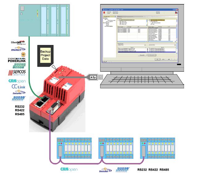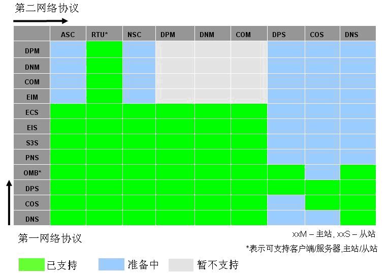 其中:ASC = ASCII, RTU = Modbus RTU Client/Server, NSC = netSCRIPT, DPM = PROFIBUS DP-Master, DNM = DeviceNet Master, COM = CANopen Master, EIM = Ethernet/IP Master, DPS = PROFIBUS-DP Slave, COS = CANopen Slave, DNS = Devicenet Slave, ECS = EtherCAT Slave, EIS = Ethernet/IP Adapter (Slave), PNS = PROFINET IO Device (Slave), OMB = Modbus TCP (OpenModbus), S3S = SERCOSIII Slave