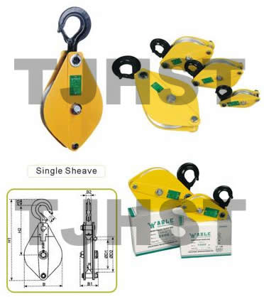 按輪數的多少分為單門滑車、雙門滑車和多門滑車。按滑車與吊物的連接方式可分為吊鉤式滑車、鏈環式滑車、吊環式滑車和吊架式滑車四種。一般中小型的滑車多屬于吊鉤式、鏈環式和吊環式,而大型滑車采用吊環式和吊梁式。按輪和軸的接觸不同可分為輪軸間裝滑動軸承及滾動軸承兩種。按夾板是否可以打開來分,有開口滑車和閉口滑車。開口滑車的夾板是可以打開的,便于裝繩索,一般的都是單門滑車,它常用于扒桿底腳處作導向滑車用。滑車按使用的方式不同又分為定滑車和動滑車。滑車組是由一定數量的定滑車和動滑車及繩索組成,因在吊重物時,不僅要改變力的方向,而且還要省力,這樣單用定滑車或動滑車都不能解決問題。因此,滑車組是起重工作中使用較廣的起重工具。使用方便,用途廣泛,可以手動,機動。主要用于工廠,礦山,農業,電力,建筑的生產施工,碼頭,船塢,倉庫的機器安裝,貨物起吊等如果把定、動滑車聯在一起組成滑車組,既能省力又能改變力的方向。如果用多門定滑車和動滑車聯結在一起,組成多門滑車組,能達到用較小的力來起吊重的物體,只要采用0.5~15 t的卷揚機牽引滑車組的出端頭,就能吊起幾噸或幾百噸的物件。。電話零二二-二四三二六六一一,傳真零二二-二四三二六零六零聯系人:P張女士