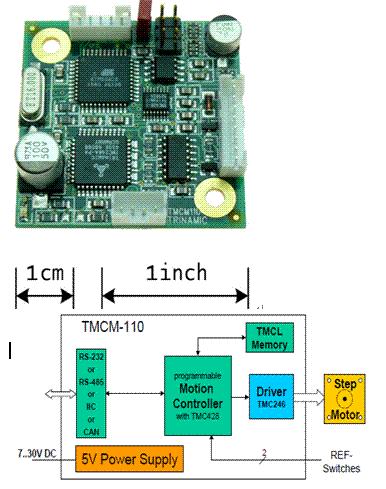 上圖為具有失速檢測功能的驅動芯片TMC249,才用低功耗設計不需要散熱裝置,下圖為使用TMC246和TMC428開發的單軸步進控制+驅動系統,支持RS232,485,CAN總線通訊還具有多路I/O,可以存儲程序實現脫機控制