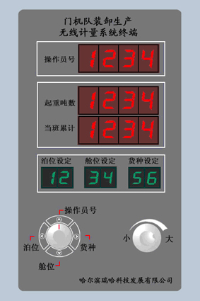 人機接口面板如圖2所示,操作員編號、起重噸數、累計重量采用大數碼管顯示,主要考慮較遠的距離也能觀察到。艙位、泊位及貨種顯示用小數碼管顯示,這些信息在工作前要操作儀器進行調整,所以只要在較近距離能夠看到就可以了,并且用綠色顯示管顯示。