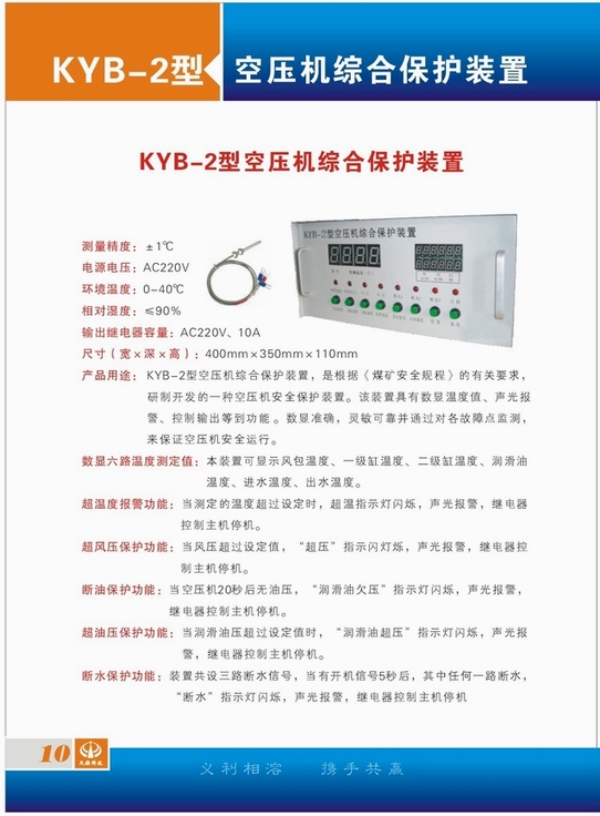 產品用途 KYB-2型空壓機綜合保護裝置,是根據《煤礦安全規程》的有關要求,研制開發的一種空壓機安全保護裝置。該裝置具有數顯溫度值、聲光報警、控制輸出等到功能 。數顯準確,靈敏可靠并通過對各故障點監測,來保證空壓機安全運行。