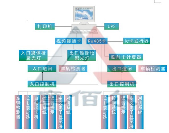 說明:各出入口設備按停車場標準布線設計,電腦聯網如距離相距小于200米,采用五類雙絞線聯網,大于200米必須使用光纖聯網。