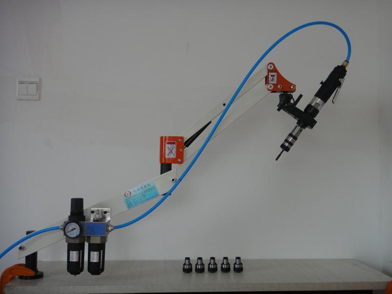 使用高壓空氣帶動(dòng)氣動(dòng)馬達(dá)來帶動(dòng)攻絲.氣動(dòng)攻絲機(jī)的馬達(dá)是使用緊湊型的葉片式氣動(dòng)馬達(dá)最大轉(zhuǎn)速可達(dá)10000轉(zhuǎn)每分鐘以上,通過形星減速機(jī)構(gòu),可以達(dá)到大扭力輸出的功能.外觀小巧.并可實(shí)現(xiàn)正反轉(zhuǎn).,氣動(dòng)馬達(dá)配上機(jī)械式手臂,最大工作半徑可以達(dá)到2000MM左右,可實(shí)現(xiàn)大工件及一個(gè)工件上多個(gè)孔位的時(shí)候,重復(fù)定位快,大大提高了工作效率