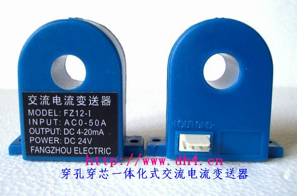 FZ系列9、12、20、25、30型穿孔穿芯一體化交流電流變送器是組合電流互感器、電流變送器于一體的新一代交流電流變送器,它可以直接將被測主回路交流電流轉(zhuǎn)換成按線性比例輸出的DC4~20mA(通過250Ω 電阻轉(zhuǎn)換DC1~5V或通過500Ω電阻 轉(zhuǎn)換DC2~10V)恒流環(huán)標(biāo)準(zhǔn)信號,連續(xù)輸送到接收裝置(計(jì)算機(jī)或顯示儀表)。