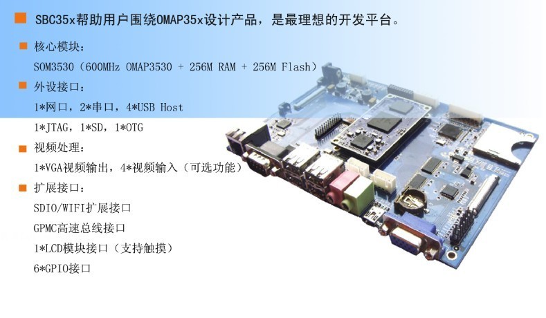 SBC3530是廣州英碼信息科技有限公司(EMA)自主研發(fā)的一款基于OMAP3530的評(píng)估板,在設(shè)計(jì)上兼容EPIC工業(yè)標(biāo)準(zhǔn),并使用可擴(kuò)展的結(jié)構(gòu),幫助客戶充分利用OMAP35x處理器的優(yōu)點(diǎn),包括超標(biāo)量的ARM Cortex-A8 RISC core、C64x+ DSP 、SGX 2D/3D圖形加速引擎。