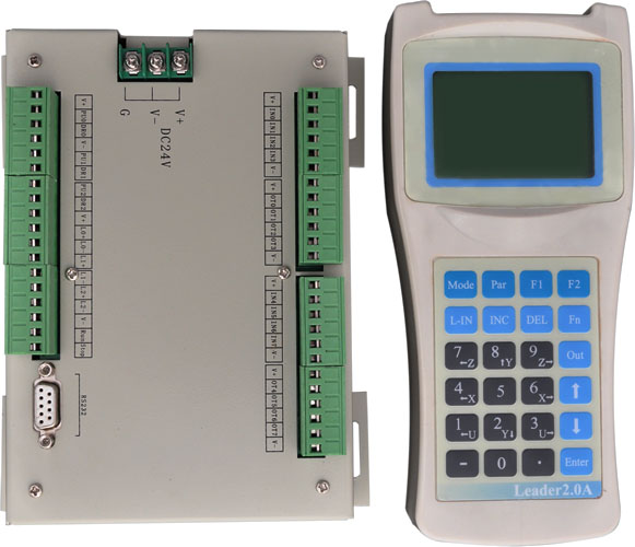 功能特點 1. 本系統為三軸運動控制系統,適用于步進電機的各種仿形場合如:切割機、 點膠機、描圖機等控 制應用,可以控制兩軸或三軸平臺; 2. 中文點陣液晶顯示(128×64點陣)和27鍵薄膜開關; 3. 可以簡單、方便地實現直線、圓弧、圓以及橢圓、任意曲線的智能記憶并 模仿; 4. 控制器內置大容量存儲器,可以實現1000種加工圖形的的存儲,每個圖形 可以多達上千個有效點 5. 單個圖形中每段運動速度可設,控制電機高速、高精度; 最大有效速度: >600KHz / 三軸同時運動; 6. 可以對多達8個輸出點進行有效控制; 7. 加工圖形的編輯簡單、好用。 8. 外接手持合(Leader10A),可脫機,并能進行設備間圖形拷貝及保存;