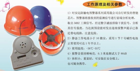 時安達牌防觸電語音預警器是我公司具有自主知識產權的產品,產品通過了電力工業電力安全工器具監督檢驗測試中心檢驗。產品適用于發、變、送、配、農電和在電氣設備上工作的人員,在高低壓線路和電器設備等危險環境安裝、檢修時,當線路帶電并且與工作人員的距離小于安全距離時預警提示工作人員已靠近帶電線路需嚴格按安全工作規程操作的作用,可直接安裝在安全帽內,也可隨身攜帶,是電工特種作業人員的一種極為有效的輔助安全用品,該產品是目前市面上功能最強,性能最好的預警器。