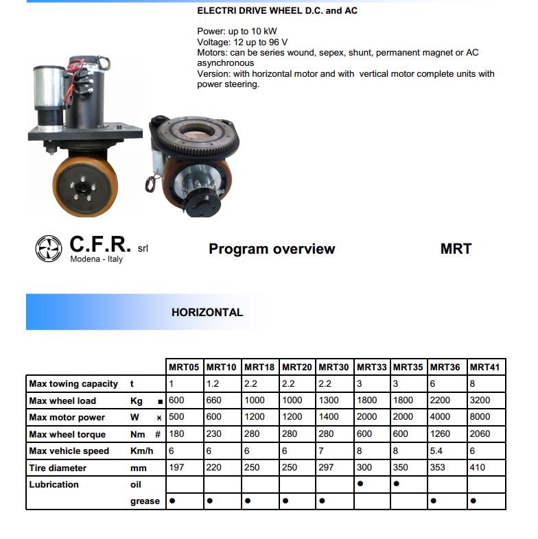 意大利CFR SRL是一家成立于1979年的意大利第一家,也是最有實力的生產安裝有直流電機,交流電機的電動驅動輪(舵輪)的成套產品的公司。經過幾十年的不斷發展,意大利CFR SRL已成為世界上產品系列最全面的物流倉儲設備配套廠商之一,也是全球領先的AGV,叉車,高車作業平臺車的部件生產商之一,產品行銷全球五大洲六十多個國家和地區。意大利CFR SRL主要產品有: