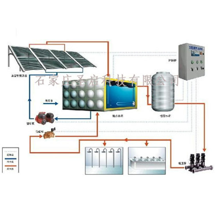 石家莊圣啟科技有限公司自主設計研發的SQG-YN太陽能供水自動控制系統,是利用太陽能光熱科技、自動化控制技術、傳感技術、PLC無線通信技術為一體的自動化監控管理系統。該系統充分利用太陽能光熱科技產生熱水,并利用自動化控制技術對熱水、冷水管道集中監控,可監測水管道流量、流速、壓力、太陽能水箱的液位、溫度等,并通過無線通信技術將設備運行狀態清晰的顯示給用戶。