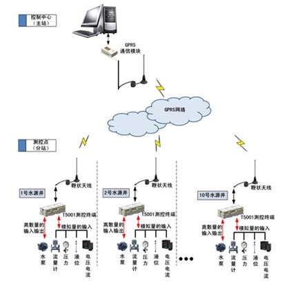 ◇現場井位控制分站主要由數據采集模塊、電磁流量計、壓力變送器、液位傳感器、電磁閥、測控儀表、數據接發儀、避雷器、電源控制器、繼電器單元、配電控制機柜及安裝附件組成。它與中心主站監控平臺通過無線數傳電臺或GPRS/3G網絡方式連接到一起。水源地各井位泵房為分站,中心泵房統領各分站,通過中國移動的無線數據傳輸設備,實現點到多點的通訊,從而最終實現對各井位泵的遠程集中監視和控制。