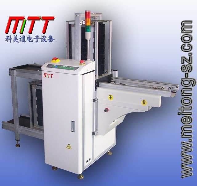UNLOADER SMT自動收板機(jī)(下板機(jī)) 型號:MTT-XB-A3 深圳市美通電子設(shè)備有限公司http://www.meitong-sz.com,0755-27905052,13510163050,適用:SMT和AI自動生產(chǎn)線,生產(chǎn)完成后自動將PCB板收進(jìn)料架內(nèi),無須用手接觸PCB板,更好的保護(hù)了PCB板。并可設(shè)置升降格數(shù),本機(jī)具有升降精度高、自動進(jìn)出料架、故障(音、色)報警功能,是實(shí)現(xiàn)全線自動化及高產(chǎn)量的必備設(shè)備特點(diǎn): 1. 采用可編程控制器PLC控制系統(tǒng)。 2. LED輕觸式控制界面,操作方便。 3. 收板推進(jìn)采用SMC無桿型氣缸推PCB板進(jìn)料架,推力可調(diào)保防PCB板 不被推壞。 4. 氣控采用進(jìn)口中排電磁閥,使推板氣缸可以停在任意的位置。 5. 料架定位用4個氣缸分別固定料架的4點(diǎn),使送板的精度更為可靠。 6. 收板出口裝有PCB保護(hù)感應(yīng)器,更為有效的保護(hù)了PCB板。。 7. 收板步距可分為四種(10,20,30,40MM) 8. 可放置3個料架(或者客戶要求) 9. 方向可選取從左至右或右至左 10.標(biāo)準(zhǔn)配備信號,可與其它設(shè)備進(jìn)行在線連接. 本公司所有設(shè)備均可根據(jù)客戶要求定做!