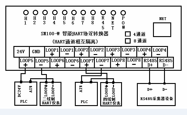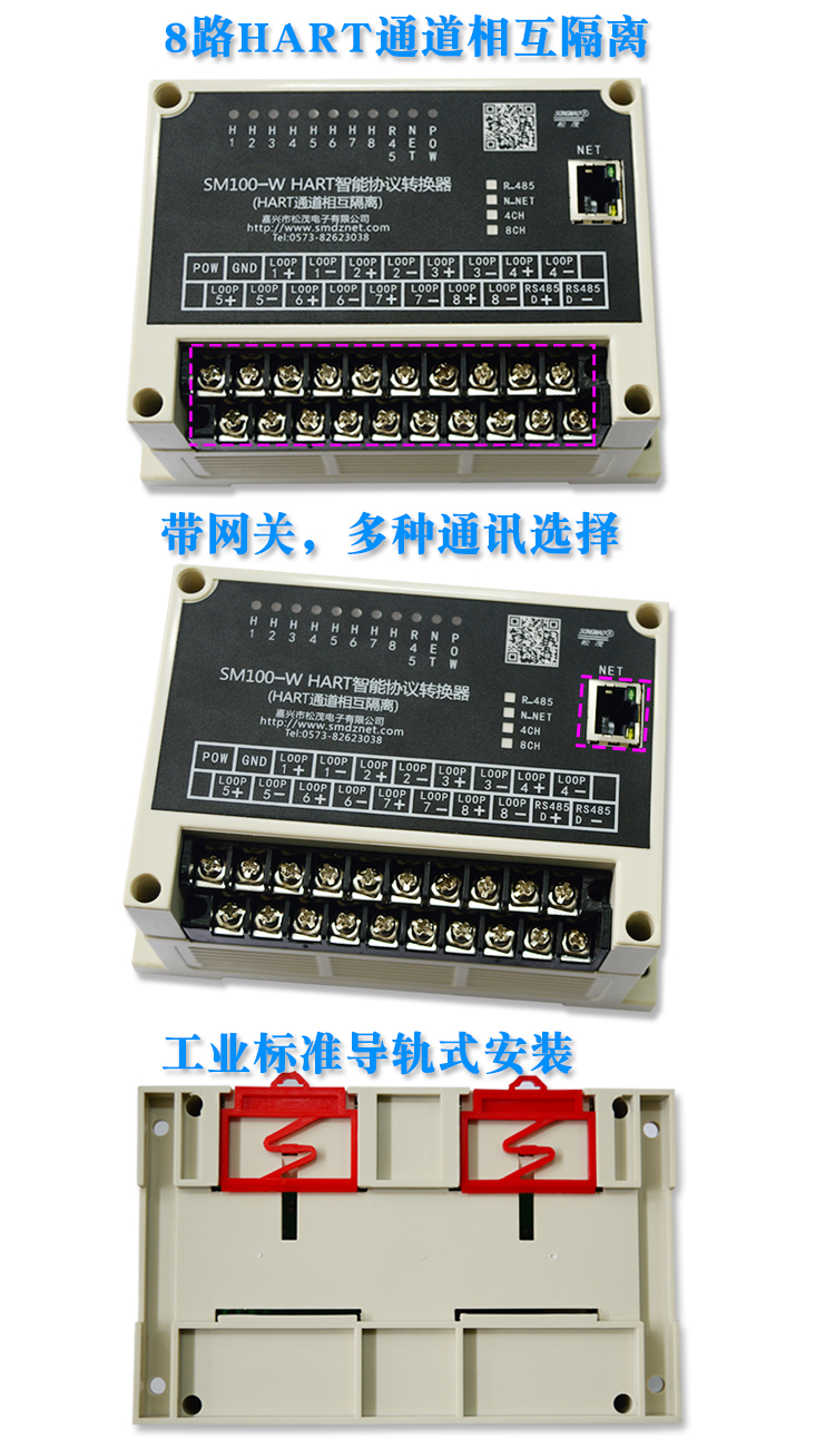 一、產(chǎn)品特點(diǎn): ● 配有1個(gè)標(biāo)準(zhǔn)的RS485通訊接口,可以進(jìn)行參數(shù)配置、更改通訊波特率及奇偶校驗(yàn)位。 ● 配有1個(gè)標(biāo)準(zhǔn)的以太網(wǎng)通訊接口。 ● 采用工業(yè)通用的模塊外殼,便于安裝及調(diào)試。 ● 配有專用配置軟件,可以對(duì)SM100-W系列智能轉(zhuǎn)換器進(jìn)行參數(shù)配置,并且通過智能轉(zhuǎn)換器,可以與HART協(xié)議智能儀表進(jìn)行數(shù)據(jù)通訊。 ● 支持標(biāo)準(zhǔn)的MODBUS_RTU及MODBUS_TCP協(xié)議。 ● 支持同時(shí)連接多臺(tái)HART協(xié)議智能儀表。 ● HART每個(gè)通道相互隔離, 不影響儀表電流輸出 ● 支持多種特殊HART協(xié)議智能儀表,并能自定義讀取特殊HART儀表的指令。 ● 數(shù)據(jù)更新時(shí)間,1臺(tái)0.8秒,如果接8臺(tái)6.4S全部更一次數(shù)據(jù)。 ● 安裝方式:可以標(biāo)準(zhǔn)軌道安裝,也可固定安裝 二、產(chǎn)品參數(shù): ● 電源輸入電壓:DC 12~24V,電源的波紋不得大于200mA,電流需提供100mA。 ● 物理尺寸:長(zhǎng)145 mm × 寬90 mm × 高73 mm。 ● 工作環(huán)境溫度:-20℃ ~ +80℃。 ● 相對(duì)濕度:10% ~ 80%。 三、接線圖