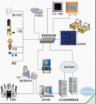 (DAV-TeCH)酒店客房網絡集成系統 (IST500-H) 一 客房網絡集成概述 電子門鎖、取電開關、電器集控、寬帶上網等已是星級酒店客房普遍配置的弱電設備。目前這些設備各自獨立,互無聯系?头考删褪菍⑦@些相互獨立的設備,通過有線或無線的方式連接到客房集成控制器上,并通過客房寬帶網與酒店各部門的電腦相連,從而使原來獨立的設備變成實時在線的網絡設備并成為統一的客房弱電系統。示意圖如下: A.客房弱電設備集成及網絡化的目的 ● 彌補現有設備不足提升設備性能 針對電子門鎖的安全漏洞實現防盜報警 實時查看門鎖操作狀態;房間取電狀態 免除門鎖頻繁更換電池、丟失時鐘等問題 ● 創新功能增加酒店自身的服務特色 豐富規范的服務請求;關懷體貼的文字信息 豐富客人門卡的管理手段 B.實現客房集成的技術方針 ● 利用TCP/IP通訊技術保障系統通訊的可靠性、實時性。 簡化施工、方便管理。 ● 系統模塊化設計保障產品的可靠性,靈活性、擴展性。 充分滿足用戶需求,并降低系統造價。 總之,通過客房集成,將越來越多的客房弱電設備和強電控制開關統一組織管理起來,從而使設備在保留原功能的基礎上發揮更大的效能,為酒店的經營管理提供更多的幫助。同時依靠專業的IT技術保障系統可行性、可靠性、擴展性。