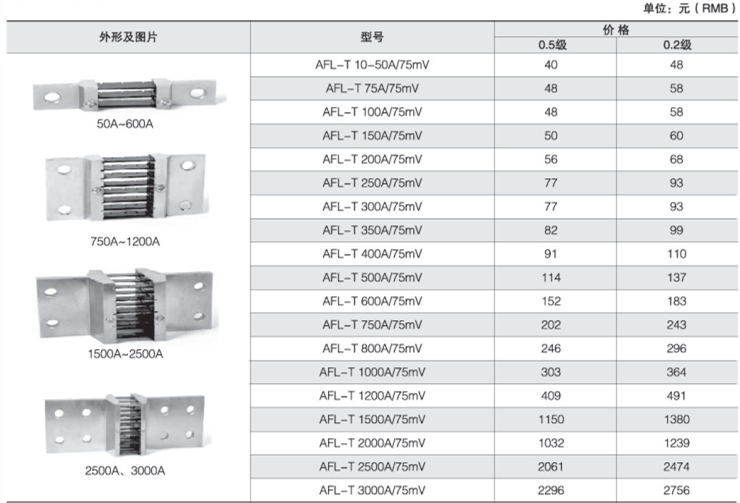 定值分流器主要用于大電流的測量,其工作原理類似小阻值的四端測量電阻,通過測量電流壓降的方法來反映出被測電流的大小。AFL-T系列定值分流器主要由錳銅材料與銅端子用銀合金焊接后制成,兩側銅端子各有一組電流測量端及電壓取樣端,最大額定電流10kA,結構上≤50A時采用塑料底座固定安裝,>50A時直接用銅端子固定安裝。當分流器與指針式電流表配套使用時,由于電流表實際上為一阻值約數歐姆的毫伏表,因此必須用與電流表配套供應一對定值導線相連接;當分流器與數字電壓表配套使用時,則可用任意導線相連接。