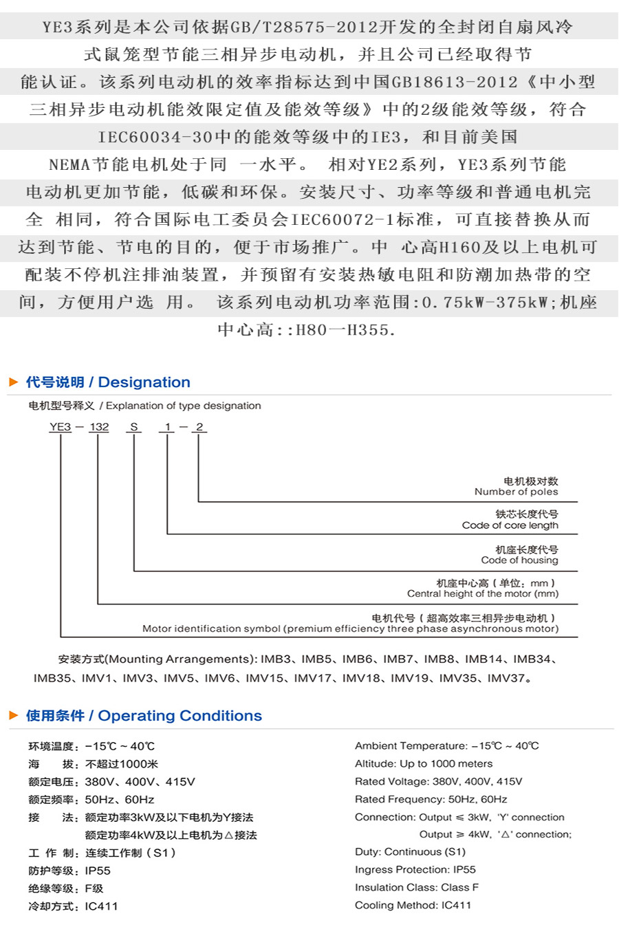 YE3超高效率電機(jī)采用了高導(dǎo)磁低損耗冷軋無(wú)取向硅鋼片,具有超高效,節(jié)能,低振動(dòng),低噪音,性能可靠,安裝維護(hù)方便等特點(diǎn)。可用于壓縮機(jī),風(fēng)機(jī),水泵,破碎機(jī)等機(jī)械設(shè)備,及在石油,化工,醫(yī)藥,礦山及其它環(huán)境條件比較惡劣的場(chǎng)合作動(dòng)力源使用。YE3電機(jī)是國(guó)家主導(dǎo)推廣取代Y,Y2,Y3,YX3系列電機(jī)的最新型號(hào),在目前國(guó)際能源越來(lái)越緊張的情況下,高效率電機(jī)成為市場(chǎng)寵兒,必將逐步取代老型號(hào)高耗能的Y系列電機(jī)。