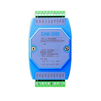 DAM-3088 簡介: DAM-3088模塊是全新一代基于嵌入式系統(tǒng)的熱電偶溫度采集模塊,采用標(biāo)準(zhǔn) DIN35 導(dǎo)軌安裝方式,現(xiàn)場安裝簡單,使用靈活;應(yīng)對各種現(xiàn)場應(yīng)用。模塊配置有 RS232 接口,方便與 PC 或 PLC 通信,模塊配置有 RS485 接口,可單獨與 PC 或 PLC 通信,也可以與多個 485 模塊組網(wǎng)使用。 參數(shù): 隔離耐壓:DC 2500V ESD 保護(hù):±15KV 供電范圍:DC +8~+36V 功耗:小于 1W 工作溫度:-40℃~+80℃ 工業(yè)級V0級防火塑料外殼保障產(chǎn)品應(yīng)用各類環(huán)境安全 安裝方式:標(biāo)準(zhǔn) DIN35 導(dǎo)軌安裝 溫度采集 輸入通道數(shù): 4\8 路 K 型熱電偶 輸入溫度范圍:-40℃~1370℃ 轉(zhuǎn)換速率:3 次/秒(單通道) 轉(zhuǎn)換分辨率:0. 1℃ 支持RS485,RS232可定制CAN 測量精度:±0.5℃(典型值) 輸入端過壓保護(hù),過流保護(hù),并有低通濾波 RS485 連接 DAM 系統(tǒng)模塊 RS485 接口為標(biāo)準(zhǔn) RS485 接口,采用差分信號邏輯,邏輯“1”以兩線間的電壓差為+(2~6)V 表示;邏輯“0”以兩線間的電壓差為-(2~6)V 表示。RS485 設(shè)備組網(wǎng)連接非常簡單,只需要將設(shè)備正端和負(fù)端并接入總線即可;當(dāng)其通信距離較長時應(yīng)該特別注意網(wǎng)絡(luò)拓?fù)洌琑S485 網(wǎng)絡(luò)拓?fù)湟话悴捎媒K端匹配的總線型結(jié)構(gòu),不支持環(huán)形或星形網(wǎng)絡(luò),從總線到每個節(jié)點的引出線長度應(yīng)盡量短,以便使引出線中的反射信號對總線信號的影響最低,更多詳細(xì)信息請參考相關(guān)資料。