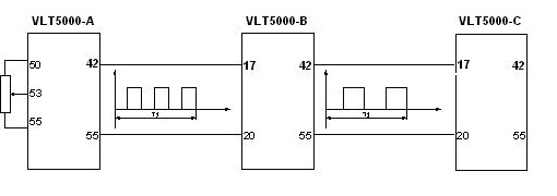 系統(tǒng)由5臺VLT5000系列變頻器及輔助的開關(guān)、指示燈、電位器及必要的空開等電氣器件組成。圖-1中A變頻器的速度作為主速給定(它自身的速度由外部電位器給定), A變頻器的42號端子對應(yīng)自身輸出轉(zhuǎn)速,自動的轉(zhuǎn)化為脈沖信號(頻率)輸出給B變頻器,作為B變頻器的速度給定信號(通過B變頻器的29號端子來接收脈沖信號),然后再由B變頻器通過修改內(nèi)部參數(shù)327號,經(jīng)過計算后相應(yīng)的輸出一定的轉(zhuǎn)速。同理B變頻器對應(yīng)自身輸出轉(zhuǎn)速自動的轉(zhuǎn)化為脈沖信號(頻率)通過42號端子輸出脈沖信號(頻率)作為C變頻器的速度給定信號(通過C變頻器的29號端子來接收脈沖信號),以此類推,一直到E變頻器。在此過程中,所有速度給定信號都是數(shù)字式的(既速度信號通過給定的脈沖頻率的變化,結(jié)合自身內(nèi)部的計算實現(xiàn)不同的轉(zhuǎn)速)。