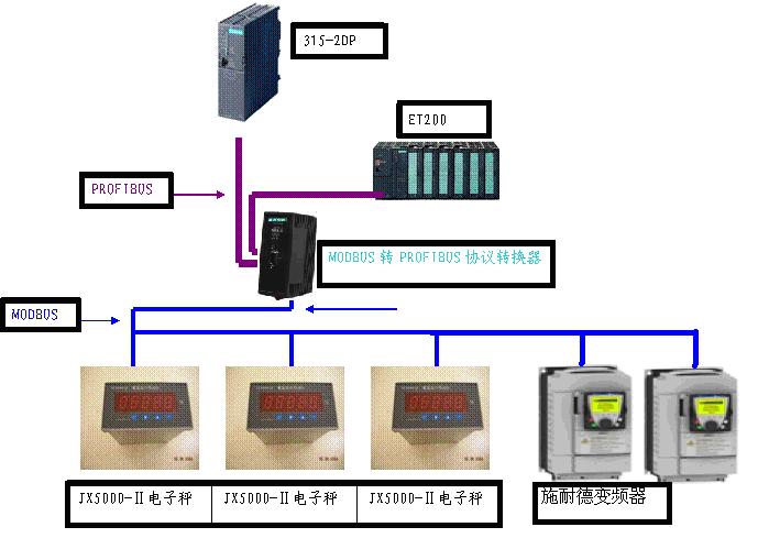 JX5000- Ⅱ電子秤二次儀表可以作為 MODBUS 總線從站與符合 MODBUS 總線規約的系統連網。通過北京微硬創新的MODBUS轉PROFIBUS網關接入到西門子S7300 PROFIBUS系統。 ( 波特率為 9600 、采數方式為應答方式。主站要從站數據時發送:從站號 03 00 00 00 01 CRCL CRCH 。從站回:從站號 03 02 DA1 DA0 CRCL CRCH)