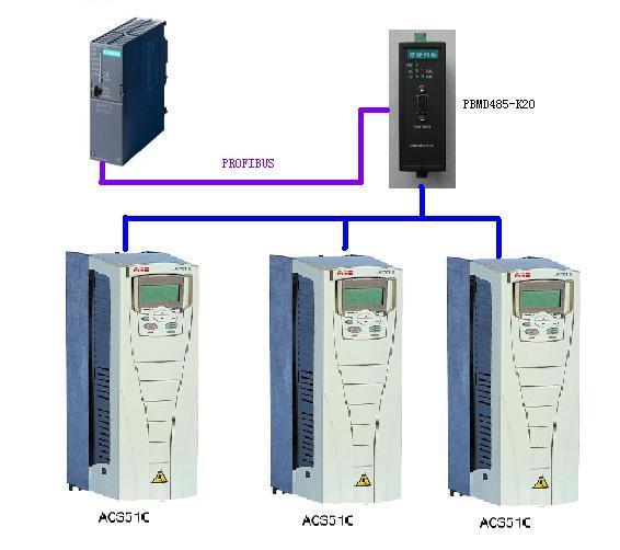成本是怎么降低的?首先,ACS510標(biāo)配有MODBUS通訊接口,沒(méi)有額外費(fèi)用。通過(guò)MODBUS轉(zhuǎn)PROFIBUS網(wǎng)關(guān)就可以將ACS510接入到PROFIBUS。由于MODBUS一端可以接多臺(tái)從站設(shè)備,一個(gè)MODBUS轉(zhuǎn)PROFIBUS網(wǎng)關(guān)可以接多臺(tái)變頻器,這樣等于多臺(tái)變頻器通過(guò)一個(gè)網(wǎng)關(guān)就可以將數(shù)據(jù)順利的送入PROFIBUS總線中。為用戶節(jié)約了大量成本,尤其是變頻器應(yīng)用較多時(shí)候,此成本優(yōu)勢(shì)變得十分重要。連接示意圖如下
