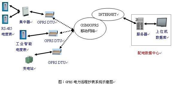 GPRS電力遠程自動抄表系統由電表數據采集部分、GPRS無線數據傳輸終端(DTU)、電力局的配電數據中心三大塊組成,電表數據通過中國移動的GPRS/GSM 網絡進行傳輸。居民小區的所有電表首先連接到電表集中器,居民用戶的用電數據由復費率電表通過串口傳到電表集中器,電表集中器通過串口與 GPRS 透明數據傳輸終端(DTU)連接,電表數據經過協議封裝后發送到中國移動的GPRS數據網絡,通過GPRS數據網絡和INTERNET公網將數據傳送至配電數據中心,實現電表數據和數據中心系統的實時在線連接。