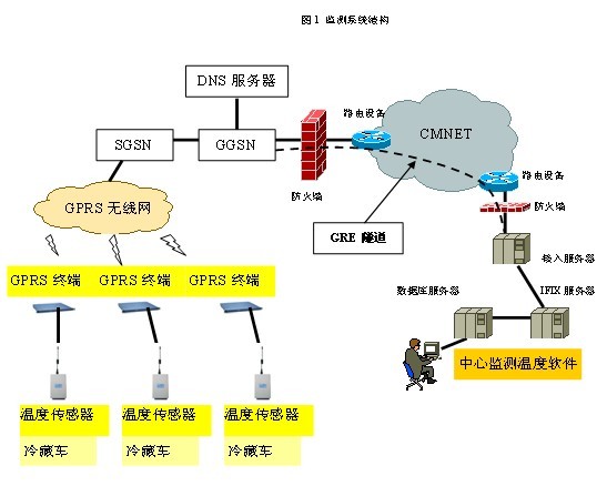監測中心由功能較齊全的計算機外圍設備如顯示器、打印機、繪圖機等組成。監測現場為各輛冷藏車,溫度傳感器和GPRS/CDMA無線終端組成。