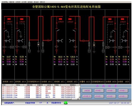 標準的變配電系統具有CAD一次單線圖顯示中、低壓配電網絡的接線情況;龐大的系統具有多畫面切換及畫面導航的功能;分散的配電系統具有空間地理平面的系統主畫面。主畫面可直觀顯示各回路的運行狀態,并具有回路帶電、非帶電及故障著色的功能。主要電參量直接顯示于人機交互界面并實時刷新。