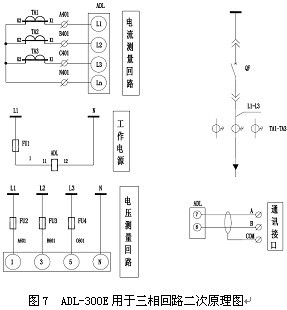 用于三相回路的二次原理見圖7,ADL-300E支持0.05A電流信號接入,電流互感器二次側不允許接地。