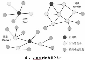 Zigbee協(xié)議基于IEEE 802.15.4標(biāo)準(zhǔn),從2004年發(fā)布Zigbee V1.0到最新的增加了Zigbee-PRO擴(kuò)展指令集的Zigbee2006版本,ZIGBEE功能不斷強(qiáng)大。Zigbee具備強(qiáng)大的設(shè)備聯(lián)網(wǎng)功能(見圖2),它支持3種主要的自組織無線網(wǎng)絡(luò)類型,即星型結(jié)構(gòu)(Star)、網(wǎng)狀結(jié)構(gòu)(Mesh)和樹型結(jié)構(gòu)(Cluster Tree),特別是網(wǎng)狀結(jié)構(gòu),具有很強(qiáng)的網(wǎng)絡(luò)健壯性和系統(tǒng)可靠性。與目前普遍應(yīng)用的wi-Fi、Bluetooth等短距離無線通訊技術(shù)相比較,Zigbee的特點(diǎn)主要有: