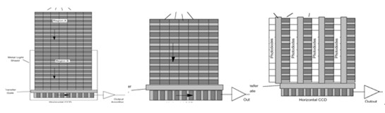 面陣CCD結構(左為楨轉移、中為全楨轉移、右為行間轉移)