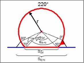 材料在同步時運動的長度: Ssync=2rsin()=77.135mm (1.1)