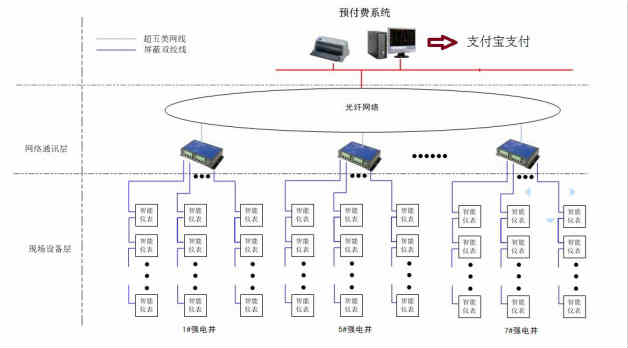 本項目設計的智能用電計量管理系統,由安科瑞品牌內控型預付費電能表DTSY1352-NK、DDSY1352-NK、通訊管理機、RS485總線(局域網)、光纖網、站控層管理計算機、系統管理軟件及預付費充值系統組成。
