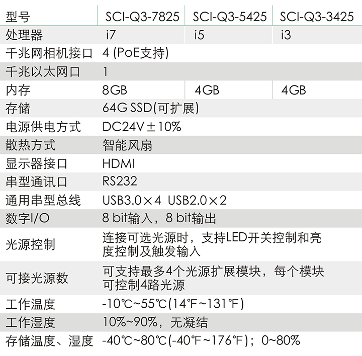 最近一段時間,我們學習了SciSmart智能視覺軟件的系列培訓課程,體會了SCI軟件的圖形化流程編輯的穩定與易用,今天我們要為大家介紹一款SCI硬件——SCI-Q3視覺控制器。 SCI-Q3是一款主動散熱設計與被動散熱設計相結合的視覺控制器,采用Intel®Core™第五代Broadwell-U處理器,支持WIN7、WIN8、WIN10等系統,默認配置WIN7系統,支持4路獨立PoE千兆網口同時采集。同時,整機采用鋁合金材質,具有良好的散熱、抗振及EMC性能。 SCI-Q3視覺控制器專為機器視覺行業而開發,集多種功能于一體,系統可靠性高,環境適用性強,已通過FCC、CE認證。